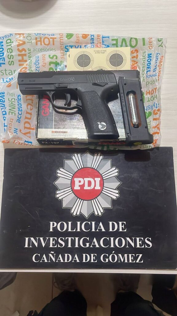 Durante el procedimiento se secuestró una pistola de aire comprimido de color negro, estilo 9 mm, marca Gama, con cargador y garrafa de gas. En el lugar se encontraba el imputado, identificado con las iniciales G. L. P., de 54 años, quien fue trasladado a sede policial para las actuaciones correspondientes.